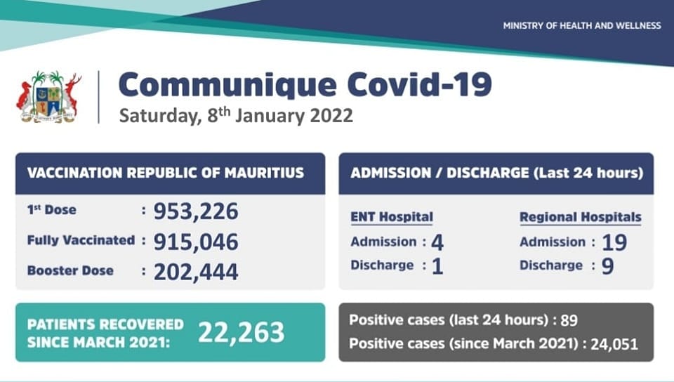 Jan 09, 2022 | Posted by JH | 0 Maurice compte 89 nouveaux cas positifs de la COVID-19. C'est ce qui ressort d'un communiqué du ministère de la Santé, émis hier (samedi 8 janvier 2022). Voir communiqué : View the discussion thread.