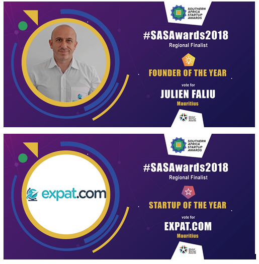 Expat.com, start-up mauricienne, remporte 2 prix au Southern Africa Start-up Awards Mauritius, une compétition à l'initiative de l'organisation Global Start-up Awards. L'édition 2018 du Southern Africa Start-up Awards Mauritius vient d'annoncer ses finalistes et Expat.com remporte deux prix : « Start-up of the Year » and « Founder of the year » pour son fondateur Julien Faliu. Cette récompense au niveau national n'est qu'une première étape. L'entreprise est à présent sélectionnée pour la deuxième phase de cette compétition, au niveau régional, et défendra sa place parmi les meilleures start-ups de l'écosystème africain. Pour remporter cette dernière phase, le vote du public est requis. La finale est prévue les 21 et 22 novembre prochains à Johannesburg.