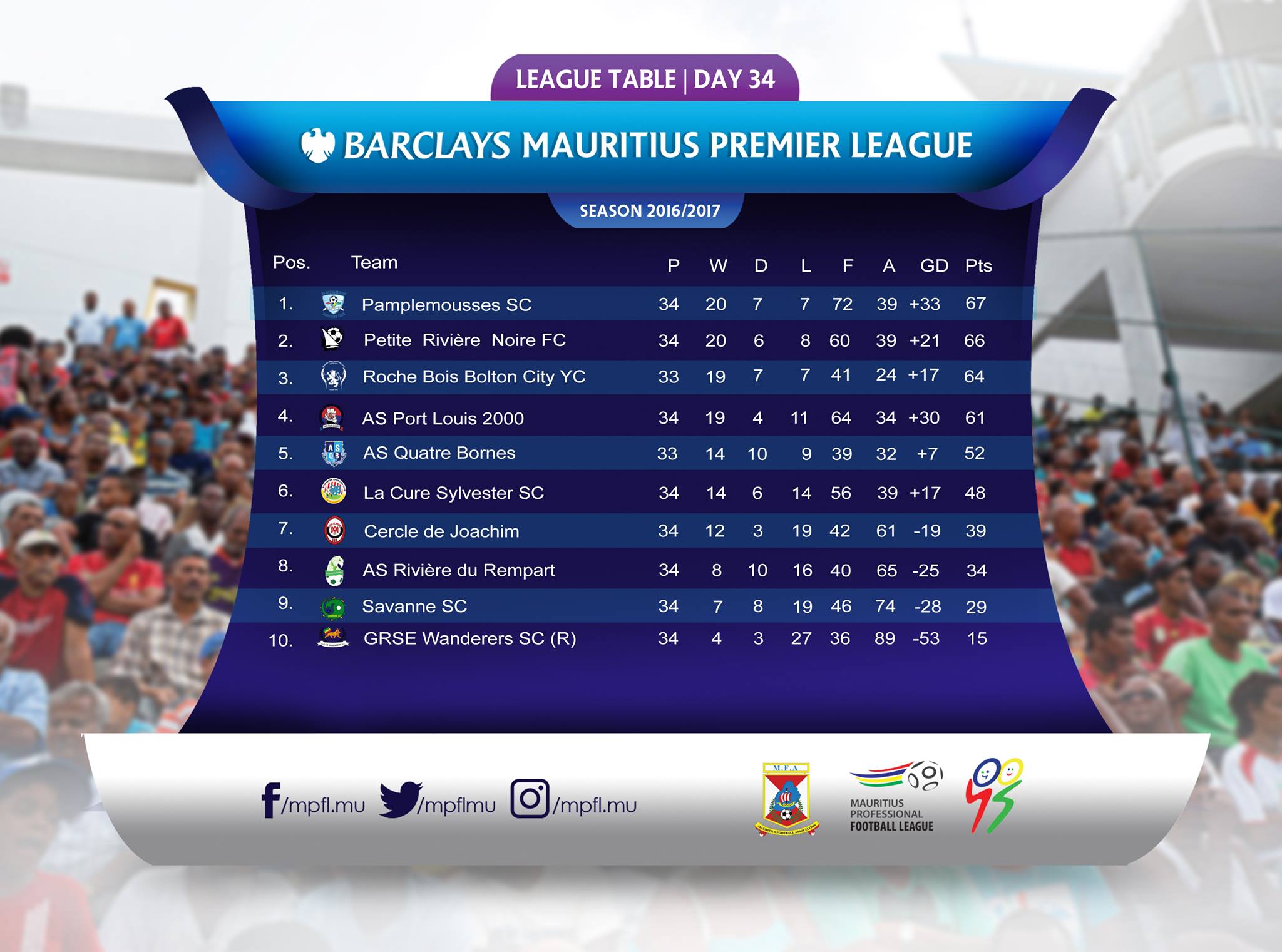 Apres 34 journees, le Pamplemousses SC est en tete avec 67 points. PRN suit derriere avec un seul point en mois que les nordistes. A la 3e place nous retrouvons RBBC avec 64 points et qui jouera cet apres midi.