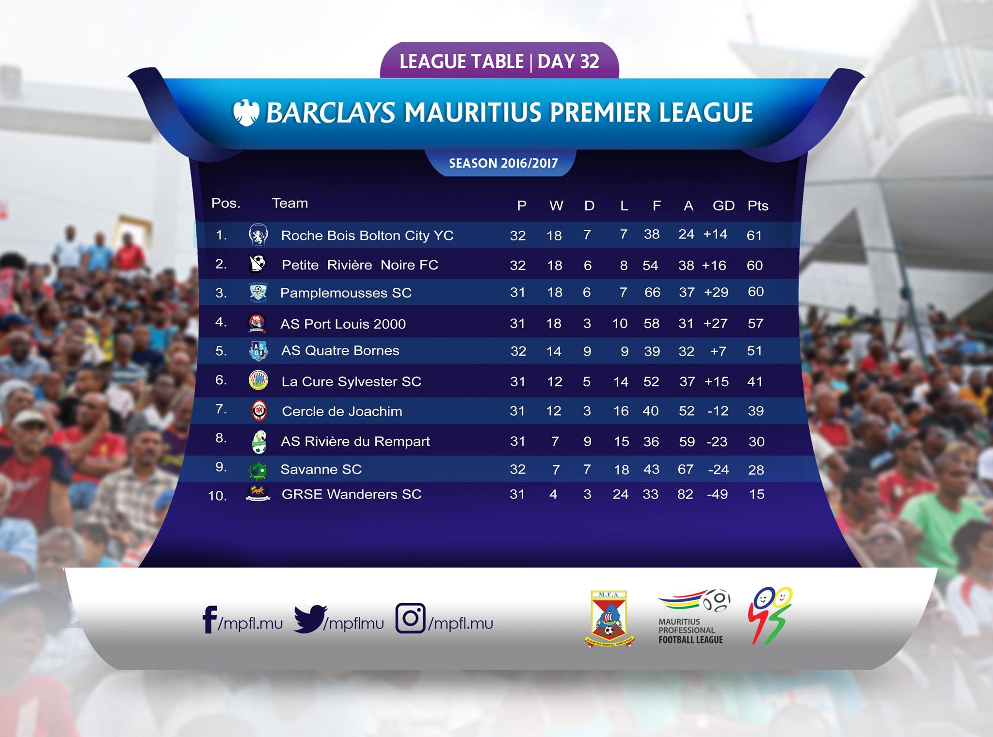 Au classement, Roche Bois Bolton City reste en tete avec 61 points, soit avec une longueur davance seulement sur Pte Riv Noire.