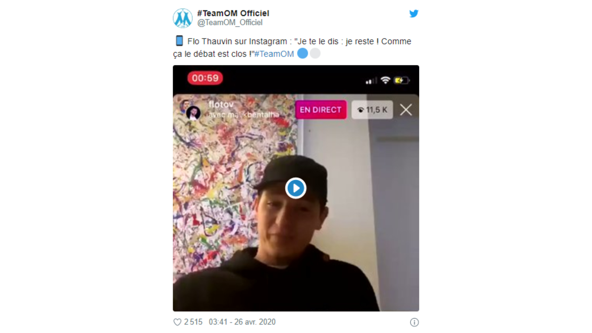Florian Thauvin a annoncé son intention de rester à Marseille dans un live sur Instagram samedi soir 25 avril.