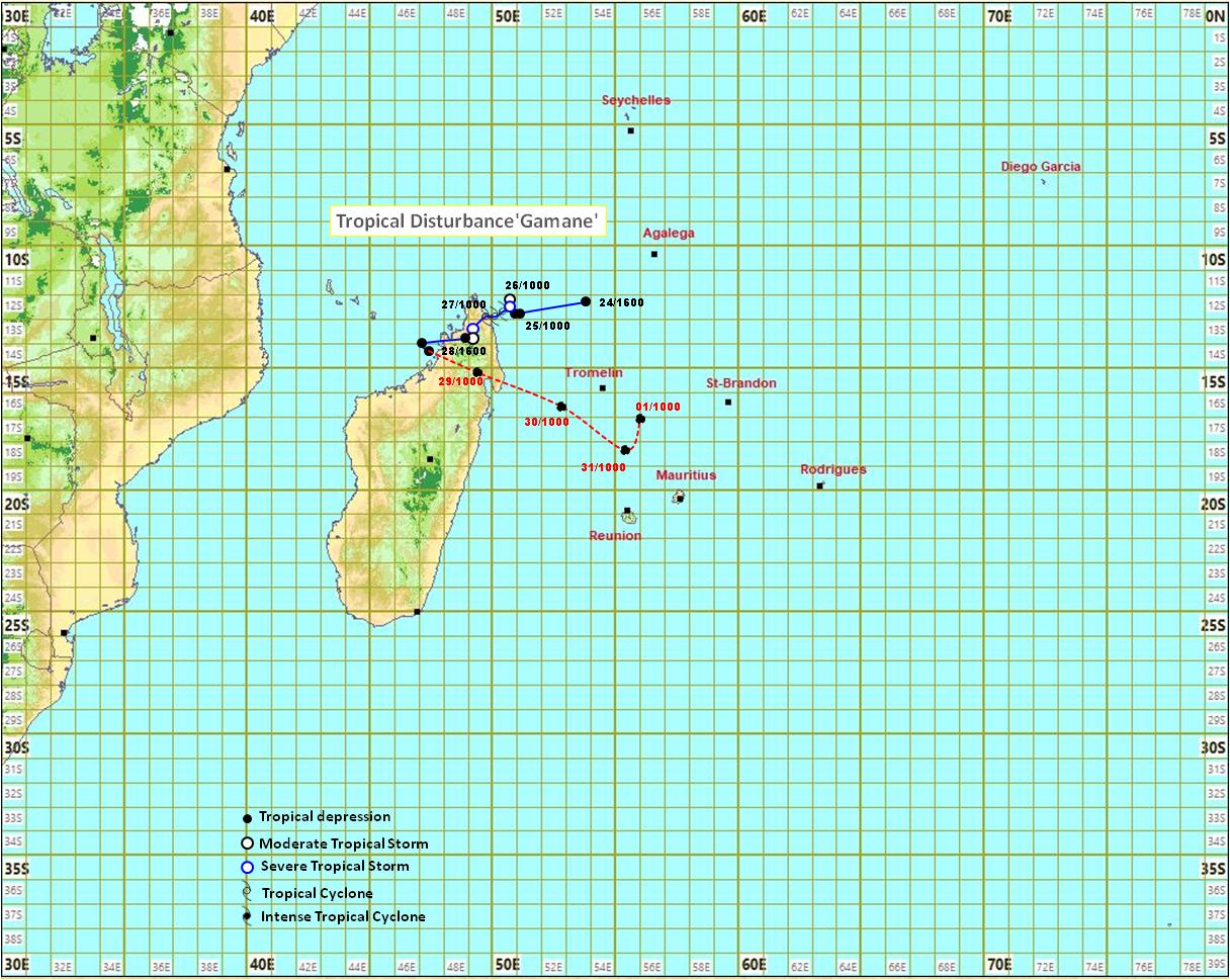 Gamane s'est considérablement affaiblie, même si des nuages convectifs actifs sont encore associés à sa circulation. Les images satellitaires indiquent que Gamane a maintenant émergé dans le canal du Mozambique sous forme d'une perturbation tropicale. La pression centrale est d'environ 1010 hPa et la rafale maximale d'environ 55 km/h. À 13 h, Gamane se trouvait très près de la côte Nord-Ouest de Madagascar, près du point 14,0 degrés Sud et du point 47,1 degrés Est. Sur cette trajectoire, elle se déplace ainsi vers l'Ouest-Sud-Ouest à une vitesse d'environ 15 km/h. Quant à l'évolution future de la perturbation tropicale Gamane, les modèles météorologiques numériques divergent considérablement. Si le système pourrait s'incurver et se déplacer vers l'intérieur de Madagascar à partir de ce soir. Il devrait ensuite traverser le continent et émerger dans l'océan Indien sous la forme d'une zone de basse pression. Il y a aussi une faible probabilité que cette circulation gagne temporairement en force et qu'elle se déplace vers les îles Mascareignes, apportant ainsi une humidité significative au nord des Mascareignes où elle devrait finalement se dissiper.
