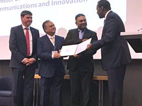 YogidaSawmynaden, Ministre de la Technologie, de la Communication et de l'Innovation, et GiandevMoteea, Chief ExecutiveOfficer (CEO) de la Mauritius Post, ont reçu ce matin le prix du Champion Régional pour l'Afrique dans le cadre de la journée mondiale de la Poste.