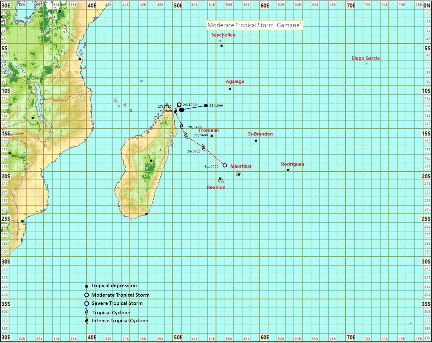 La dépression tropicale qui évoluait au Nord-Ouest de Madagascar s'est intensifiée en une tempête tropicale modérée et a été nommée Gamane par Météo Madagascar. À 10 h, ce matin, Gamane était centrée près du point 12.2'S et 50.7'E, à environ 1125 km loin, au Nord-Ouest de l'île Maurice. Elle est quasi-stationnaire.