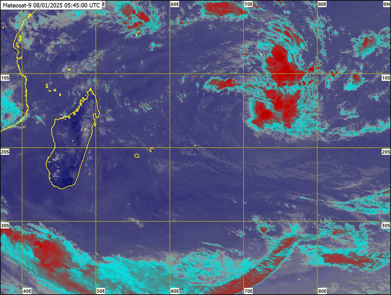 À 10h ce matin, la dépression tropicale était centrée en latitude 14,7 degrés sud et en longitude 72,2 degrés est, à environ 1360 km à l’est de Saint-Brandon. Elle se déplace vers l’ouest à une vitesse de 30 km/h. Les conditions environnementales restent favorables à une intensification supplémentaire et les prévisions météorologiques numériques montrent que le système suivra une trajectoire générale vers l’ouest. Selon les prévisions, la dépression tropicale devrait se renforcer davantage pour devenir une tempête tropicale modérée aujourd’hui. Elle sera alors nommée DIKELEDI. Il est prévu qu’elle passe très près du nord de Saint-Brandon dans la nuit du jeudi 09 janvier 2025, représentant ainsi une menace potentielle pour l’île. Le temps sera pluvieux à partir de jeudi. Les averses seront modérées à fortes par moments, accompagnées d’orages. Le vent soufflera du sud-est à 30 km/h, se renforçant progressivement pour atteindre 50-60 km/h, avec des rafales de l’ordre de 100 km/h dans la soirée du jeudi 09 janvier 2025.