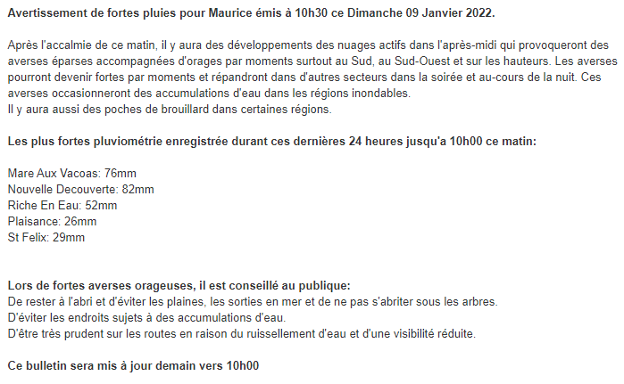 Voir communiqué de la Station météo de Vacoas, émis à 10 h 30, ce dimanche 9 janvier 2022 :