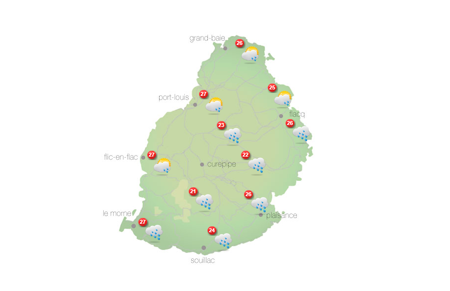 Les averses seront plus fréquentes durant la nuit sur les versants au vent et le Plateau Central. Ailleurs le ciel sera partiellement nuageux.