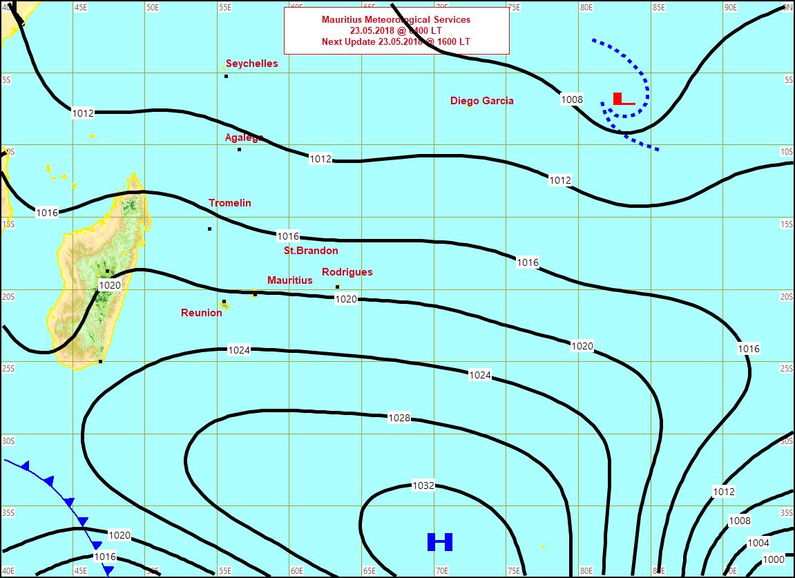 L'anticyclone au Sud-Est des Mascareignes occasionne des alizés perturbés et relativement froids sur notre région.
