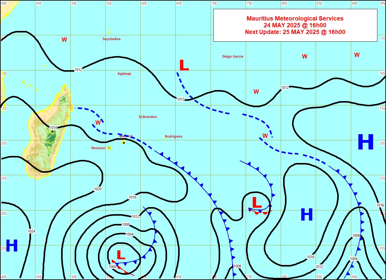 Situation générale: 1. Un avertissement de fortes houles est en vigueur à Maurice et sera valable jusqu'à mardi 27 mai 2025 à 16h00. 2. Un assez fort anticyclone évoluant au sud-ouest des mascareignes occasionne des alizés modérés et plutôt froid sur notre région, provoquant ainsi une baisse relative dans la température.