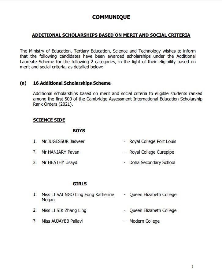 Le ministère de l'éducation, de l'enseignement supérieur, de la science et de la technologie souhaite informer que les candidats suivants ont reçu des bourses d'études dans le cadre du système de supplémentaires pour les deux catégories suivantes, en fonction de leur éligibilité basée sur des critères de mérite et les critères sociaux, comme détaillé :